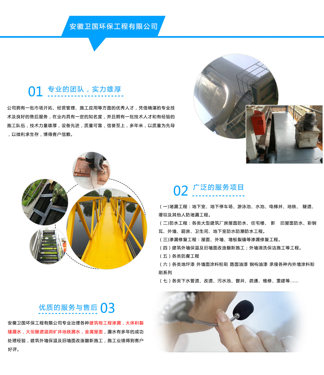 安徽衛國環保工程有限公司專業治理各種建筑物工程滲漏,大體積裂縫漏水,大壩隧道涵洞礦井地鐵漏水,金屬屋面,漏水有多年的成功處理經驗,建筑外墻保溫及舊墻面改造翻新施工,施工業績得到客戶好評。 公司擁有一批市場開拓、經營管理、施工應用等方面的優秀人才,憑借精湛的專業技術及良好的售后服務,在業內具有一定的知名度,并且擁有一批技術人才和有經驗的施工隊伍,技術力量雄厚,設備先進,質量可靠,信譽至上,多年來,以質量為先導,以微利求生存,博得客戶信賴。